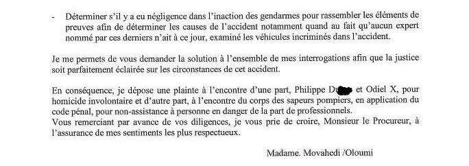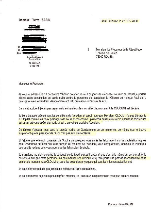 En déposant ma plainte le 14 décembre 1999, Monsieur le Procureur, j’ai soulevé plusieurs questions qui méritent d’être éclaircies, mais restent à ce jour obscures. Je suis toujours sans réponse du Tribunal. Je persiste à demander pour quelle raison mon fils n’a pas été transporté à l’hôpital, alors que les deux personnes indemnes l’ont été séparément. Pourquoi le certificat de décès n’a-t-il pas été établi par un médecin légiste, afin de déterminer clairement la cause et l’heure du décès ?